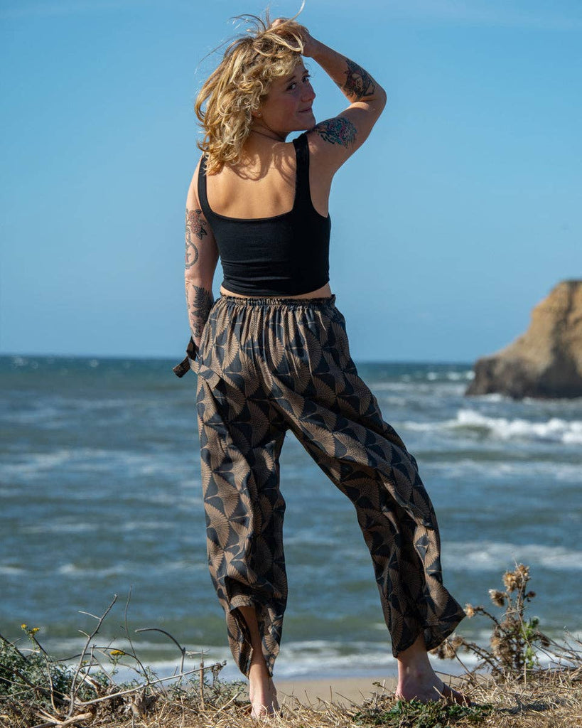 These pants feature a gray/brown crane print, and have a wide bow-leg shape * 100% rayon * one size * hand made in Thailand * SKU: ZZPA98