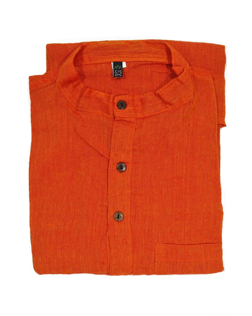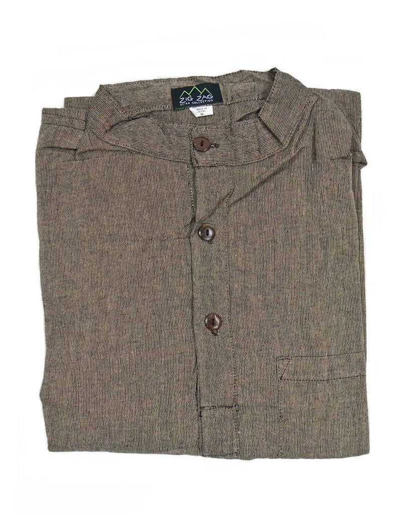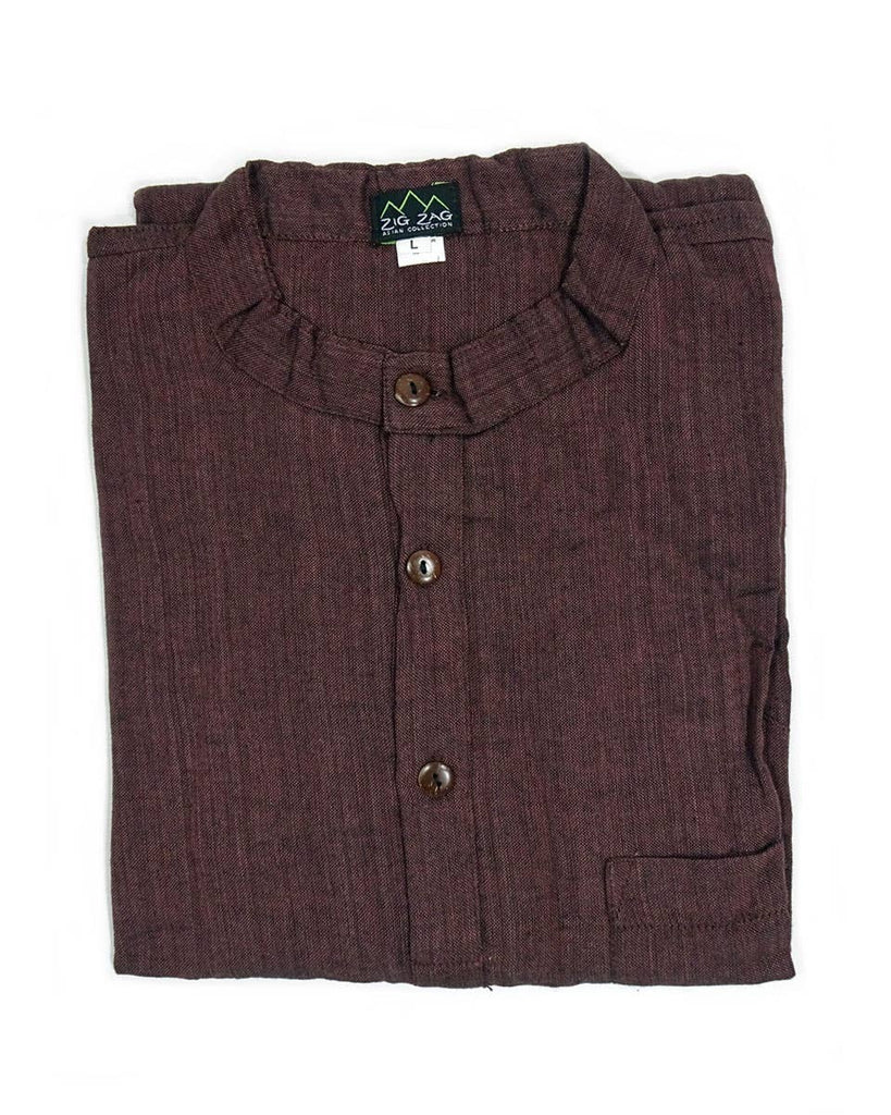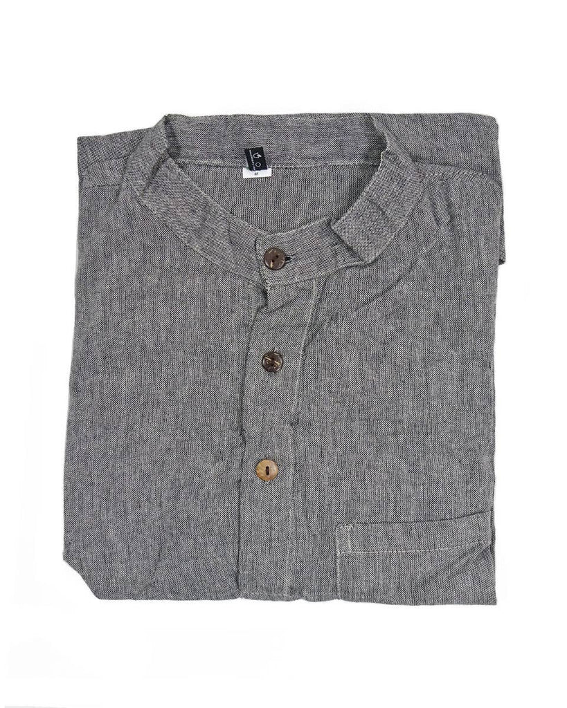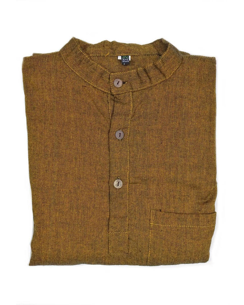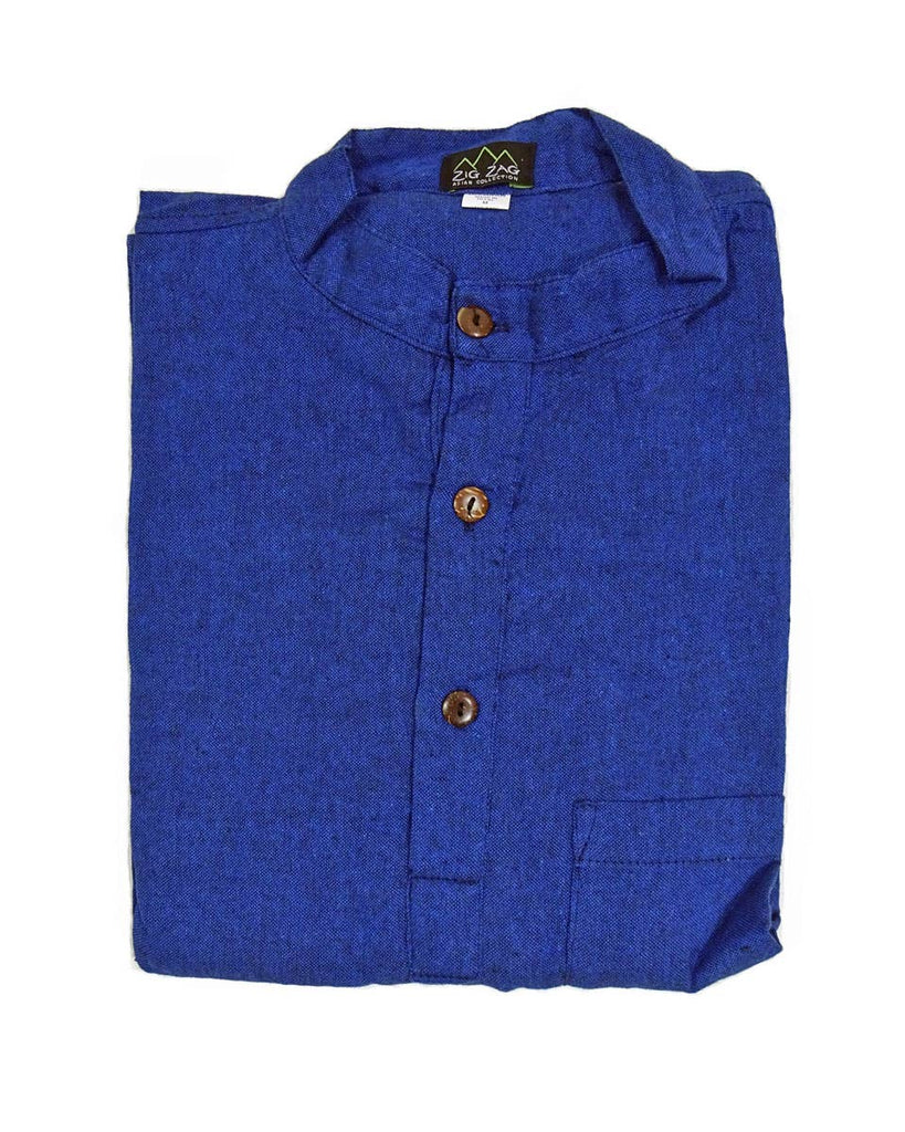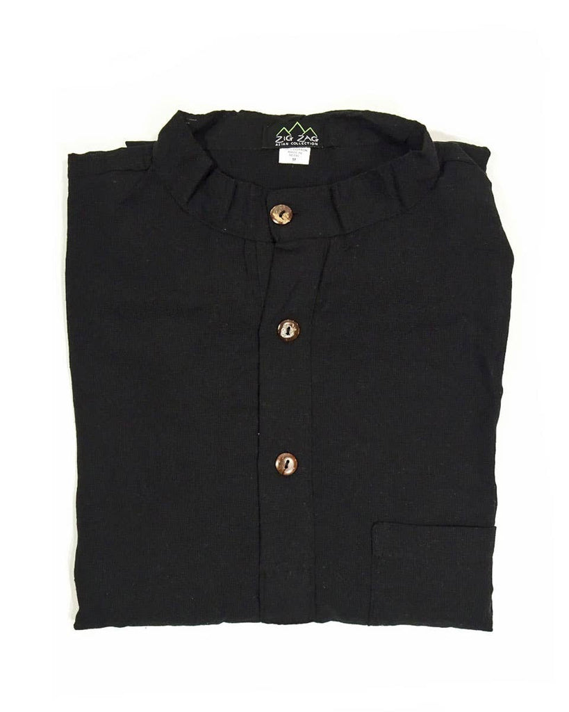 A ‘kurta’ is a traditional Nepali shirt, straight cut and loose, with long sleeves. This kurta is made with soft, hand woven cotton with a small standing collar, three coconut buttons, one chest pocket and two small slits at the side. Known for comfort and elegance, it is a perfect lightweight long sleeve for warmer months, or can be layered to be worn in winter. gender neutral 100% cotton, washing in hot water will shrink this shirt 1/2 in. in length handcrafted in Nepal