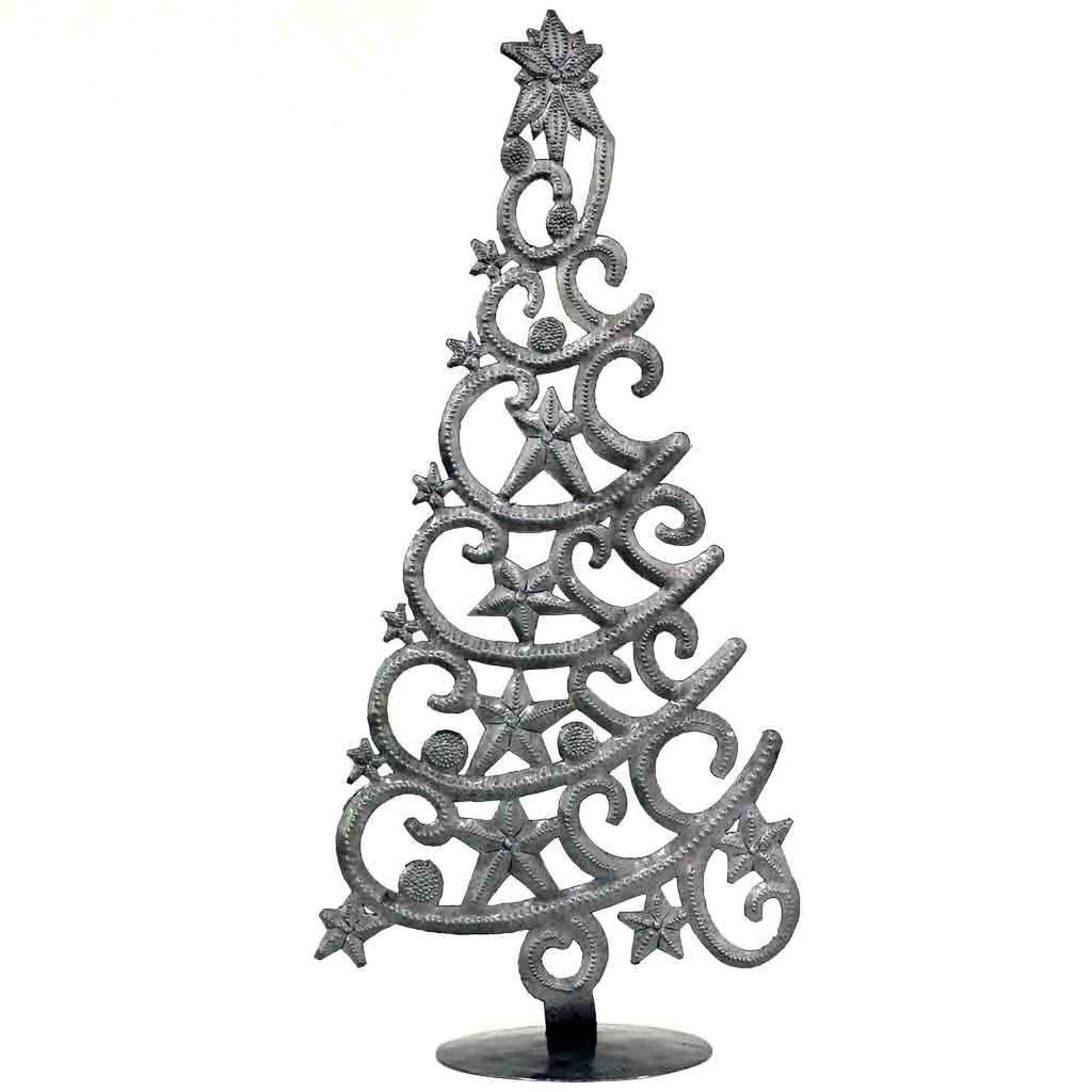 Christmas tree with stars Haitian drum metal tabletop decor. Tabletop Christmas tree features a swirling design with star, hand-cut and embossed from steel drums by Haitian artisans, it measures approximately 14" x 7".Keywords: Home Décor, Gifts , Tabletop, Christmas tree ,holiday