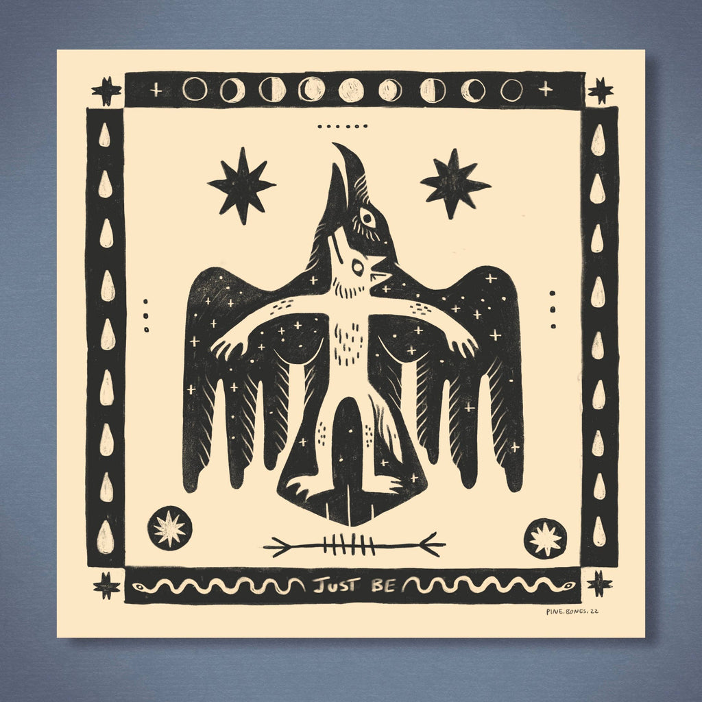Nature folk art print featuring wilderness motifs, professionally printed on archival cotton paper. Signed, gift ready, and packaged for easy retail display. A perfect addition for boutiques, galleries, and gift shops. Coyote & Raven Key Features: • Size: 8×8 inches (easy to frame) • Printed on high quality cotton paper with archival inks • Signed & titled original artwork • Unframed – versatile for custom framing • Packaged in a clear sleeve with recycled backing board • Includes branded business card inside clear sleeve. • Hand drawn design, Not AI, • Printed in the USA Pinebones is a queer Southwestern illustrator creating folk art inspired by wilderness, wildlife, and landscapes. Based in the remote Utah desert, their work blends storytelling and nature, offering art that brings a sense of place and spirit to any space.