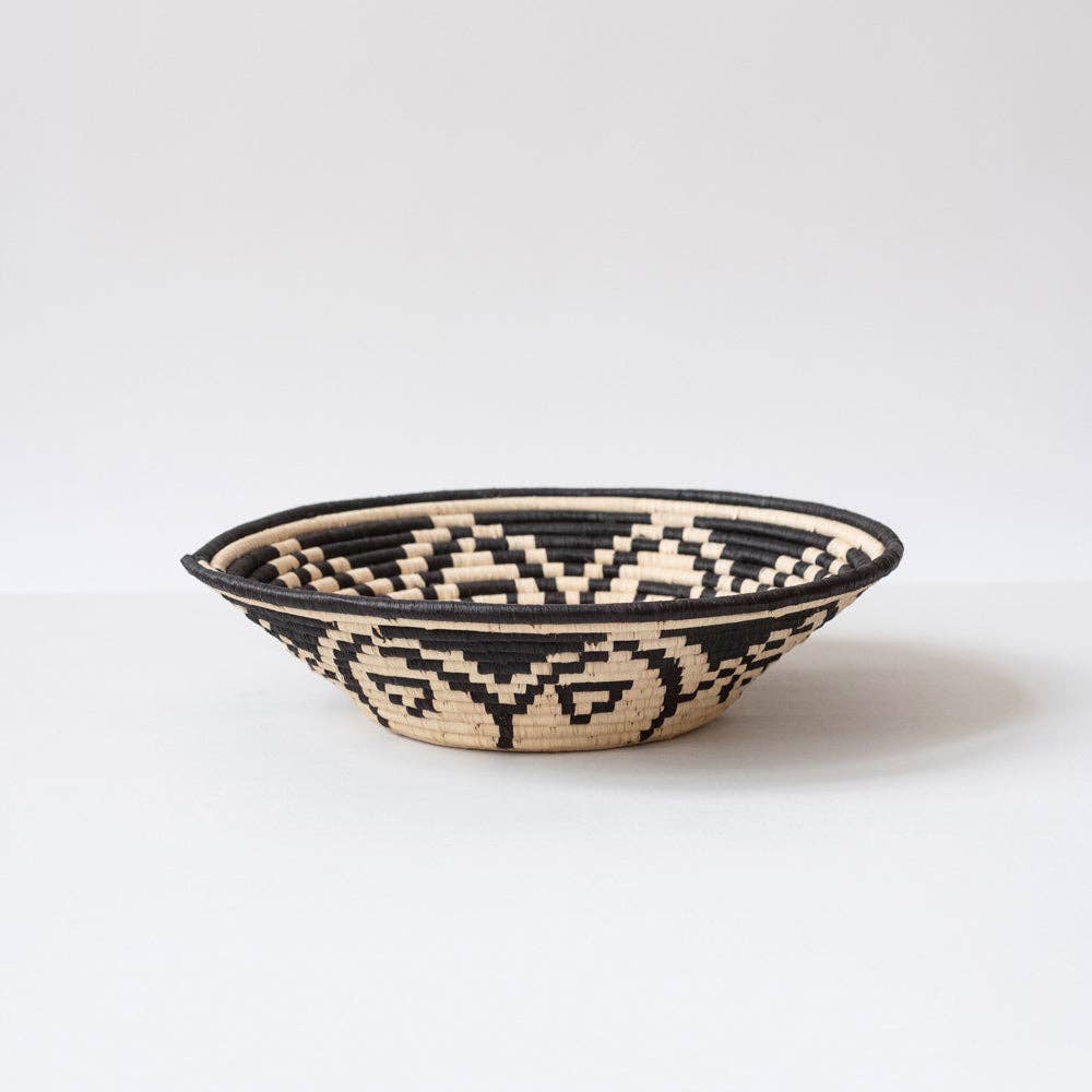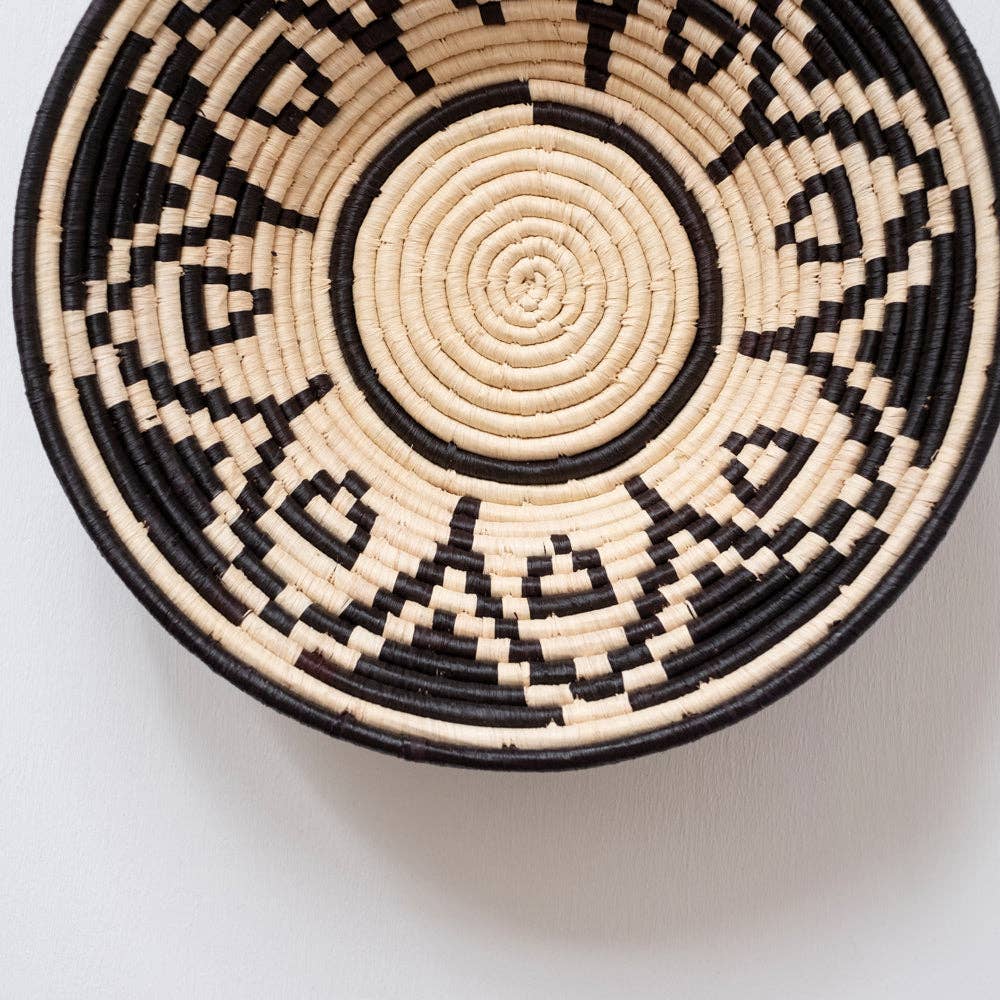 Make a wall statement with a stunning collection of baskets on display or elevate your tablescape with a unique centerpiece. A simple yet bold basket from our Black & Natural collection. Handcrafted by women artisans living in Central Uganda who are part of a cooperative that provides employment and training for disadvantaged or marginalized communities - particularly widows, the disabled and those living with HIV/AIDS. * Made from all natural, sustainably sourced raffia and banana fibers * All synthetic AZO free dyes * Hanging loop on back allows basket to be wall decor in addition to tabletop use * Weavers hand make each basket from home while tending to other household duties. Baskets can take days to weeks to complete with artists weaving 3 or so hours per day while balancing other responsibilities. * No two baskets are identical - there will be slight variations in size and color from the one shown due to the handmade nature of each product. Each basket is both special and unique. HANDMAD