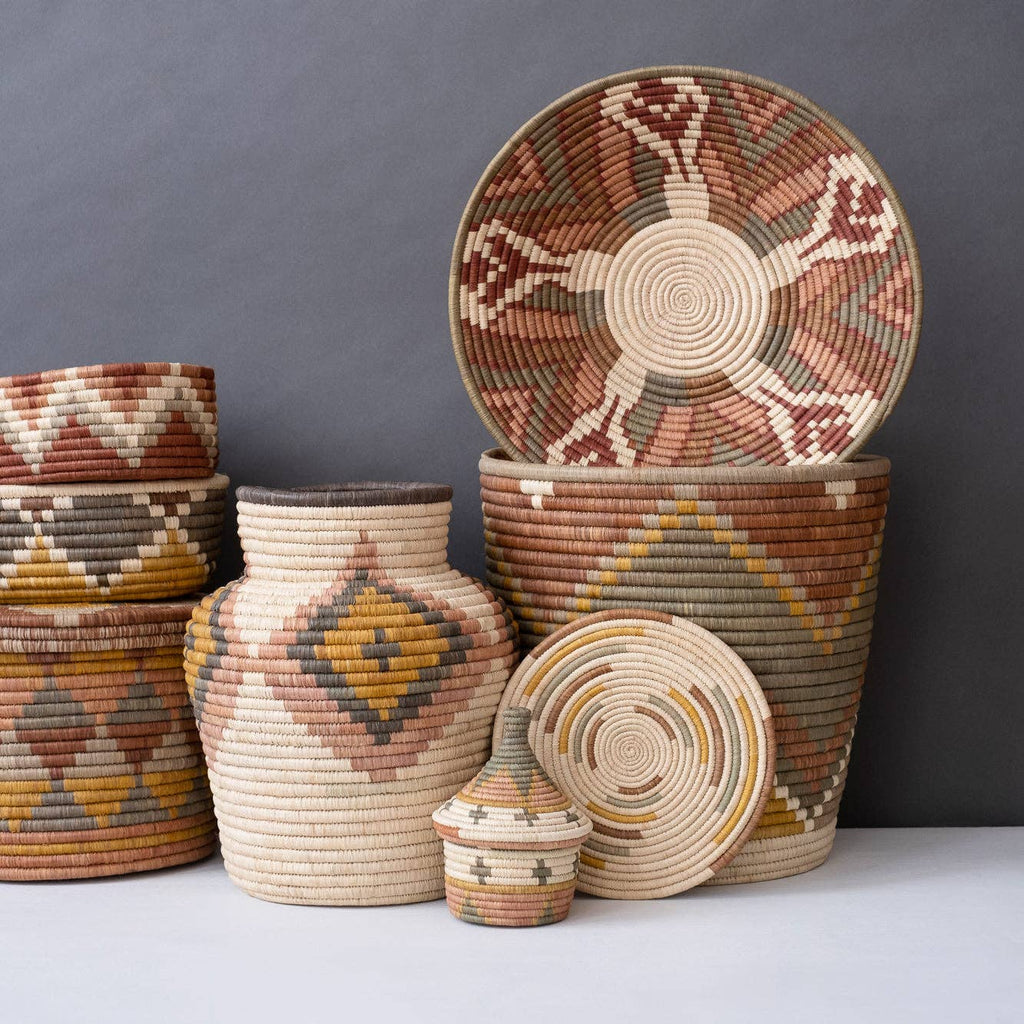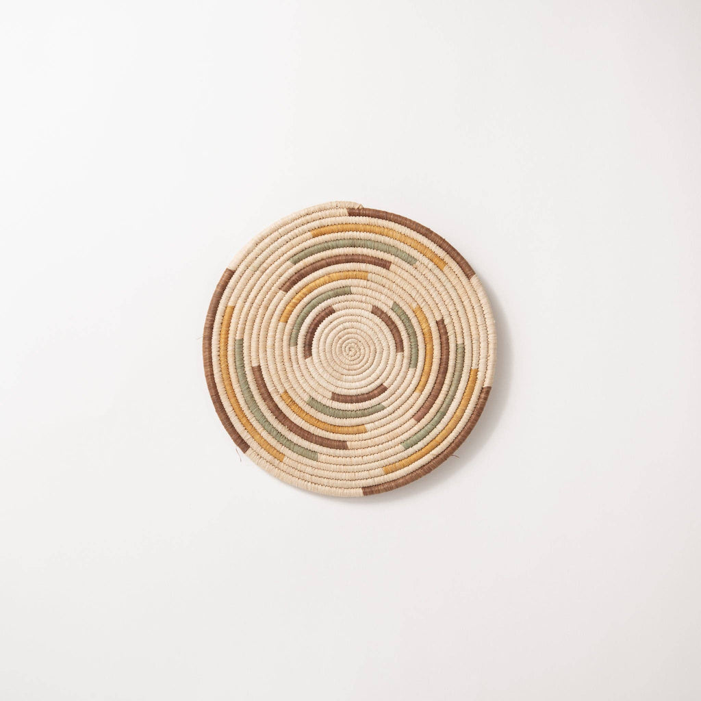 Add another useful statement piece to your table top - Use this handcrafted trivet to protect your furniture and display your home cooked goodness. Handwoven in the rich color palette of the Elevate Collection, the 2025 annual small batch basket collection. Handcrafted by women artisans from the Batoro tribe living in the very rural mountains of Western Uganda. These weavers are a part of a cooperative that provides training to single mothers, widows and other marginalized women who are subsistence farmers and weave baskets to provide additional income. * Made from all natural, sustainably sourced raffia and banana fibers. * Unique, bold mix of natural and AZO free dyes - Natural dyes are made from various plant materials grown in artisan’s villages. The women grow, harvest and make all the natural dyes which take a great deal of knowledge and skill to produce. * The hand-dyed raffia is twisted and wrapped around coils of banana fibers, creating structure and intricate designs. * No two baskets ar
