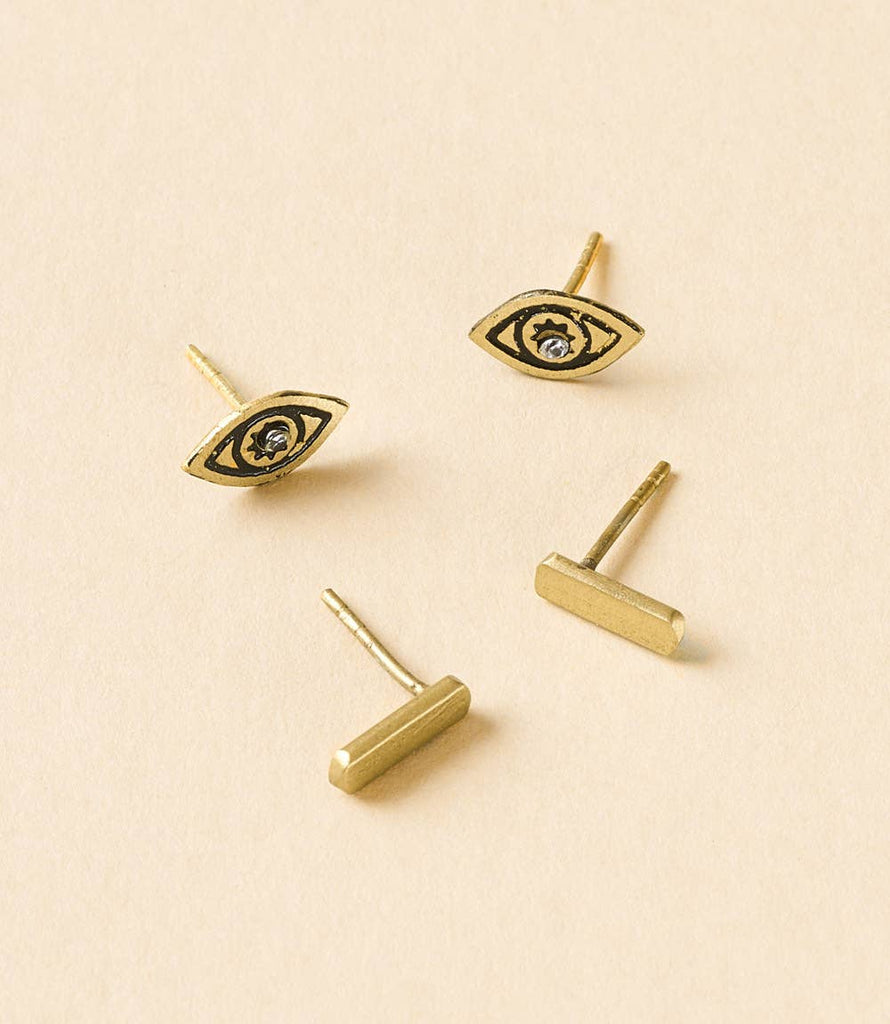 Ruchi Evil Eye Tiny Bar Gold Stud Earrings Set of 2 feature gold tone on brass. This dainty set would make a perfect gift for teens, students as a graduation gift or as a gender neutral gift for anyone who prefers simple and small stud earrings for everyday wear. Can be worn alone or as a set in multiple piercings. Mix and match with the Ruchi Crescent Moon Tiny Dot Gold Stud Earrings Set of 2 to create multiple fashion trends. All of Matr Boomie's collections are artisan made, fair trade, and sustainable.