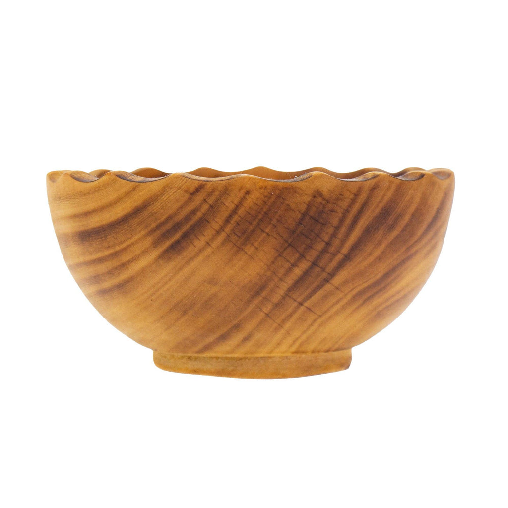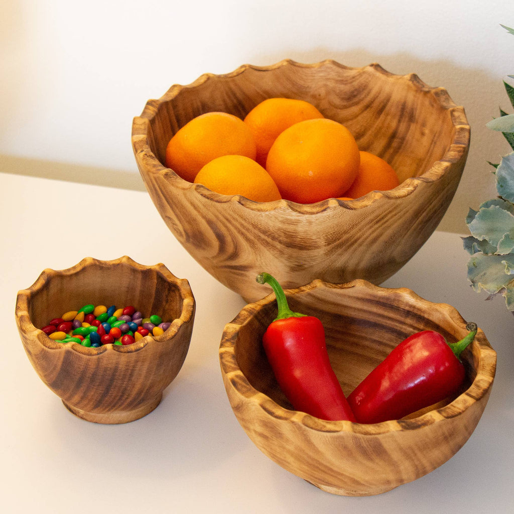 These sturdy jacaranda bowls are truly magnificent! Each bowl is artfully carved from a single piece of jacaranda wood from Kenya and finished off with a scalloped edge. The nested bowls are approximately 4, 6, and 8 inches in diameter. Skilled artisans use simple hand tools to carve these stunning pieces; the lines are exquisite and the superior craftmanship is evident throughout. These are very sturdy, functional and food-safe making them great for entertaining or a unique design element for the home. Sell as a set or as singles - these make a wonderful wedding or housewarming gift!