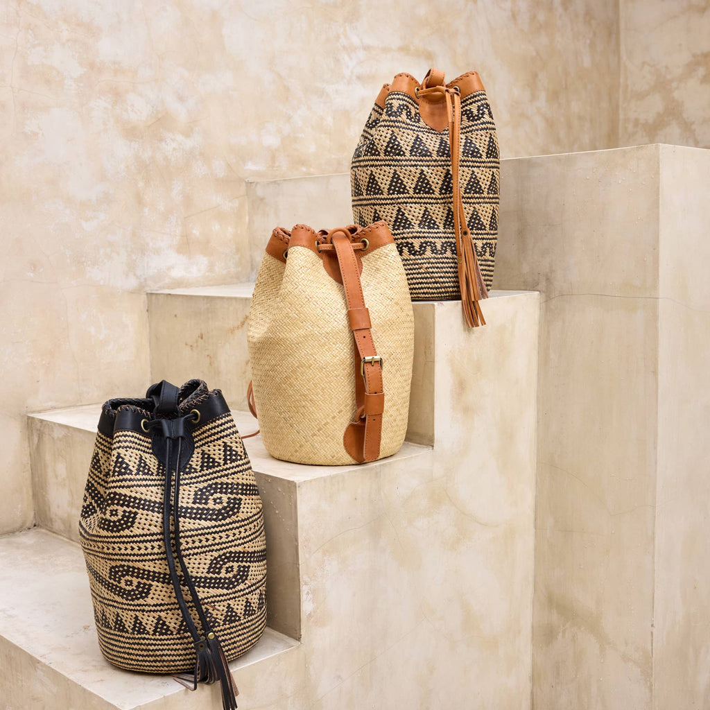 Convertible sling shoulder bag / backpack with light leather trim, leather drawstring closure and batik print lining. The sling bags and tote bags from our Borneo Collection are handwoven by the indigenous Dayak people of Borneo using split rattan from Central Kalimantan, one of the only areas in the world where rattan is harvested in a sustainable way to preserve the forest.