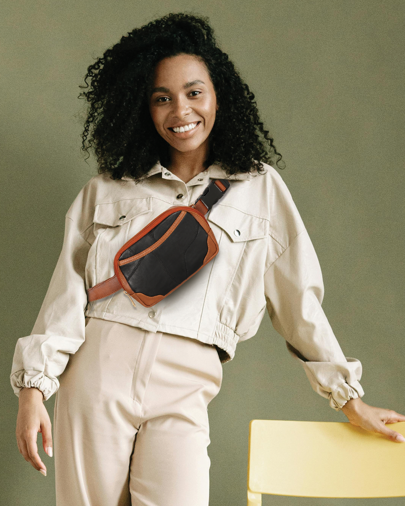 Sleek, hands-free belt bags crafted with sustainable materials for effortless everyday carry. Compact, stylish, and built to move with you—while being kind to the planet. "The ""it"" accessory has come to Vaan & Co! The Journie belt bag is designed for comfort, with the adjustable strap giving you plenty of ways to wear it; the main compartment is spaciously designed to hold your essentials, while the exterior pocket is designed to hold your phone. Size: 13.5"H x 19.5"W x 5.5"D Materials: Upcycled leather & recycled canvas